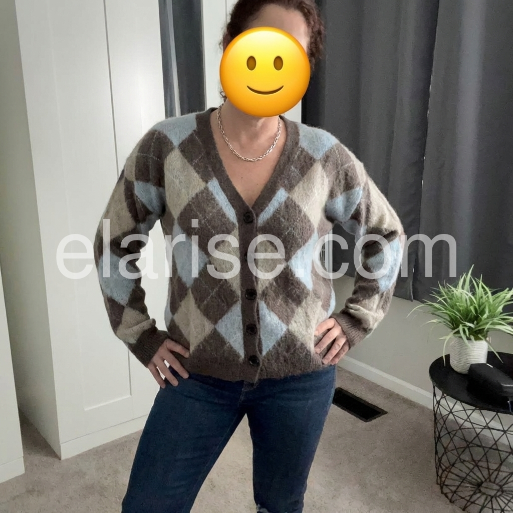 This cardigan features a timeless argyle geometric print in versatile neutral tones, offering a sophisticated layering option. Crafted with a button-front design, it allows easy wear and adjustable styling. Its refined pattern blends classic and contemporary elements, making it an ideal choice for enhancing both casual and polished outfits with subtle texture and depth.