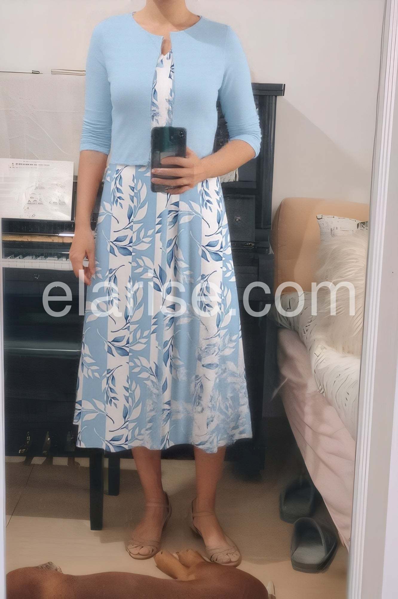 I absolutely love this dress! The light blue color is so perfect for spring, and the matching cardigan style makes it super easy to wear to the office or church. The best part? It has pockets! The material is soft and flowy. Highly recommend.
