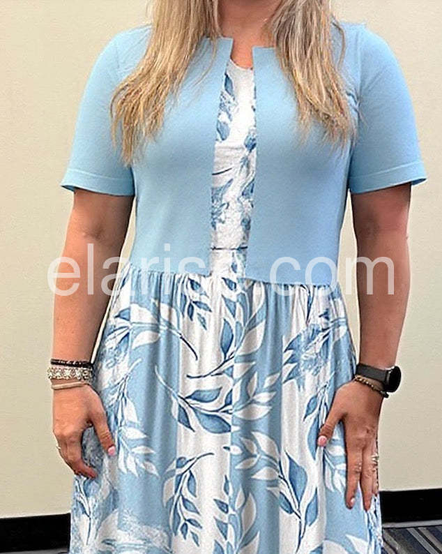 Unique Blue Plant Print Midi Dress With Jacket