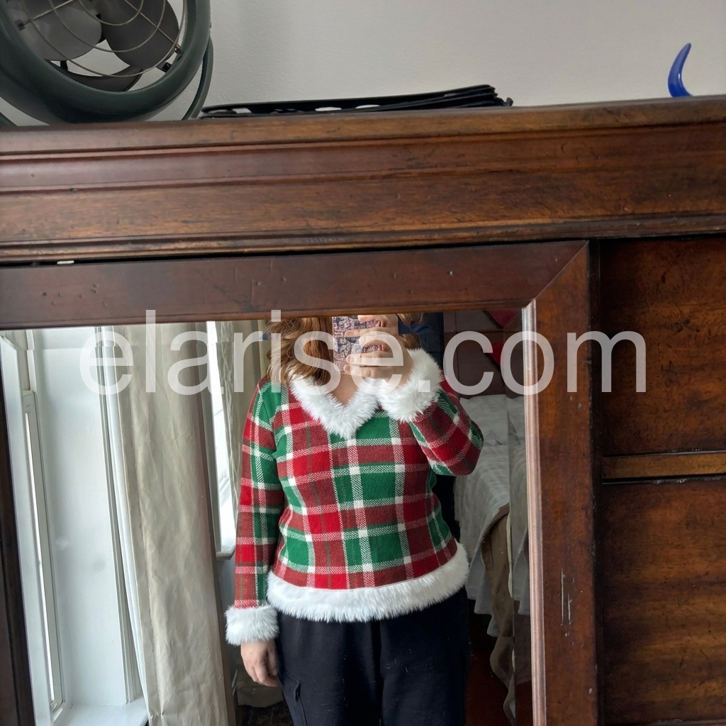 Absolutely adore this festive top! The red and green plaid is so cheerful, and the white fur trim adds a luxurious, cozy feel. The V-neckline is flattering and the long sleeves keep me warm. It’s lightweight enough to layer under a jacket, but cute enough to wear on its own. I’ll be wearing this all holiday season long!