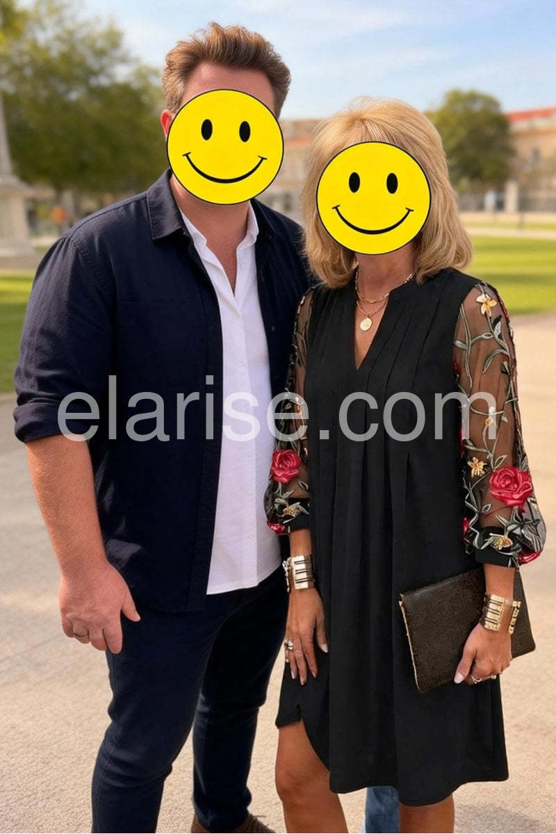 Beautiful dress! I was worried the mesh sleeves might be itchy, but they are incredibly soft and comfortable. The embroidery is stunning in person, with vibrant red roses that really pop. It drapes beautifully and hides my tummy area perfectly.