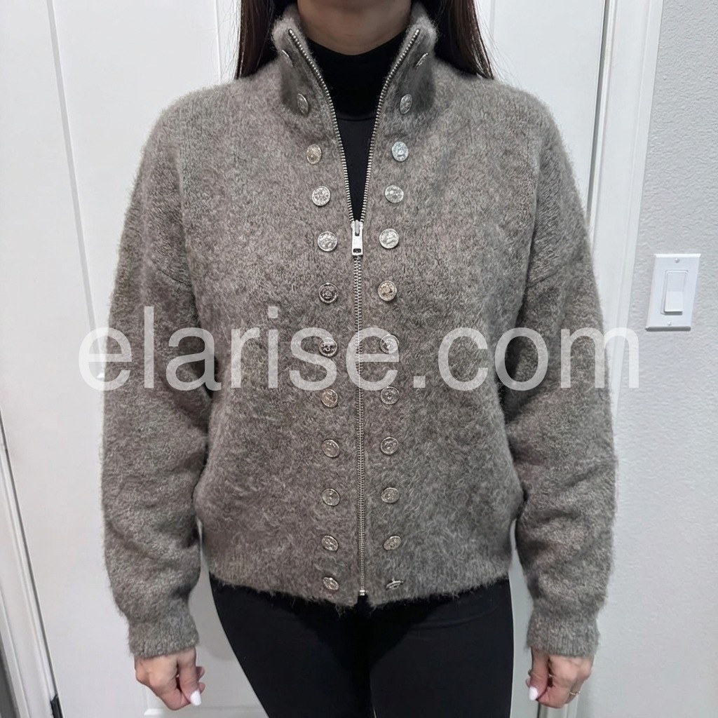 The Fuzzy Grey High Neck Long Sleeve Cardigan is a cozy and stylish addition to any wardrobe. Made with a high neck and long sleeves, it provides warmth and comfort during colder months. The fuzzy texture adds a touch of softness and style, making it a versatile piece for any outfit.