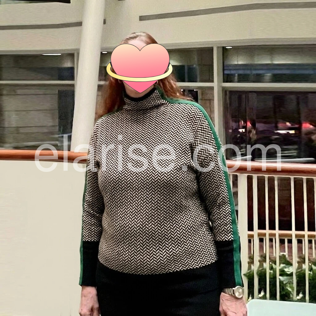 I’m so happy with this sweater! The herringbone pattern looks classy and the dark green stripe accents add a unique touch. It’s comfortable to wear and feels warm without being too heavy. The fit is flattering, and the neckline sits nicely. I’ve worn it for outdoor walks and it looks great.