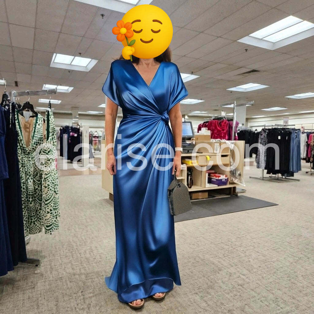 Elegant blue satin dress -- flattering knot at the waist and smooth drape. Minimal accessories with a sparkly purse elevate the look. True to size, comfy for long wear. Quick, smooth online shopping experience. Highly recommend.