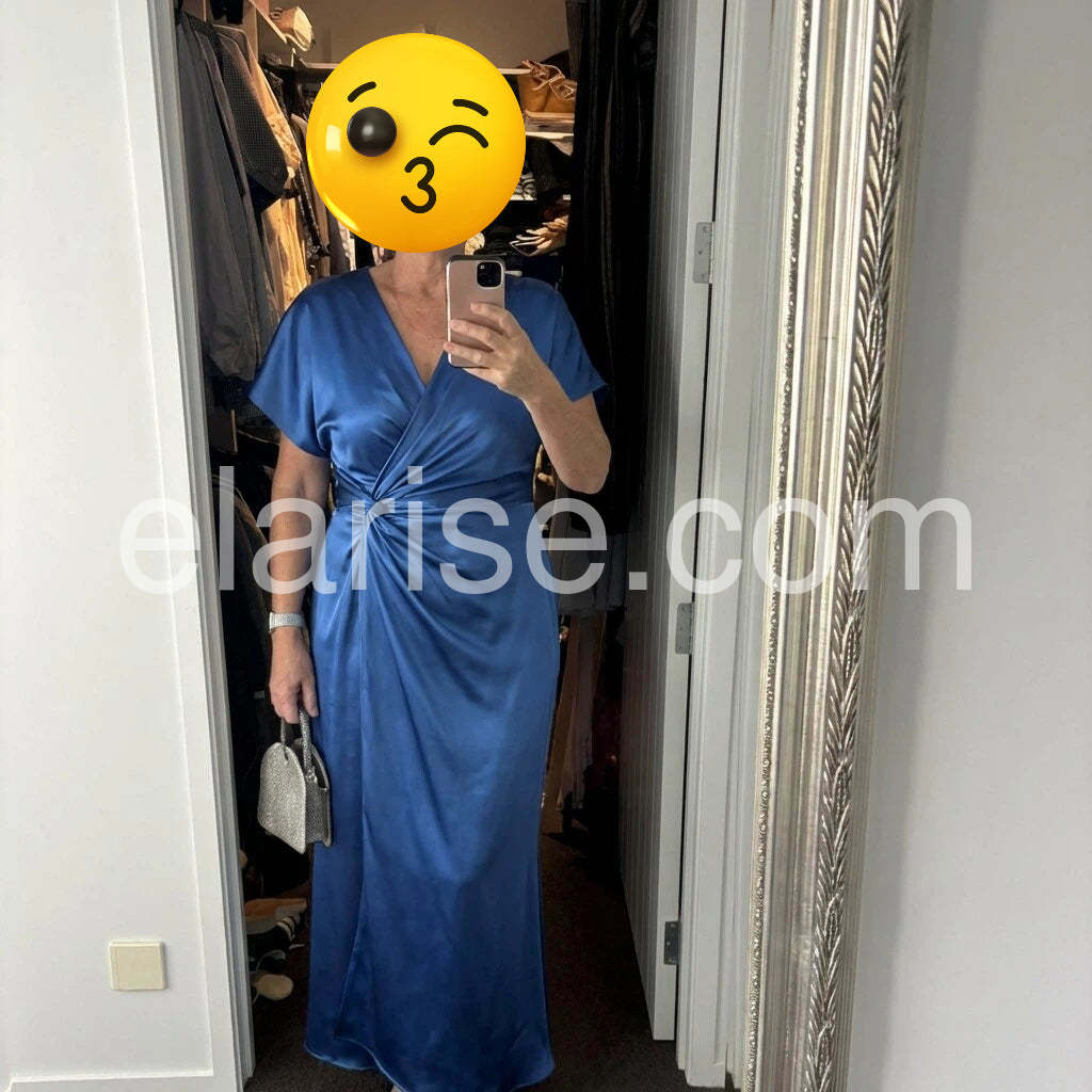 This blue satin maxi is stunning and perfect for online once you try it on at home. The wrap design with a waist knot creates a flattering silhouette, and the satin drapes beautifully. The color is rich and elegant, ideal for formal events or a classy evening out. Pairing with a small purse and simple sandals gives a polished, effortless vibe. True to size with good movement in the fabric. Smooth checkout and responsive customer support--highly recommended for a glam look you can wear online shopping with confidence.