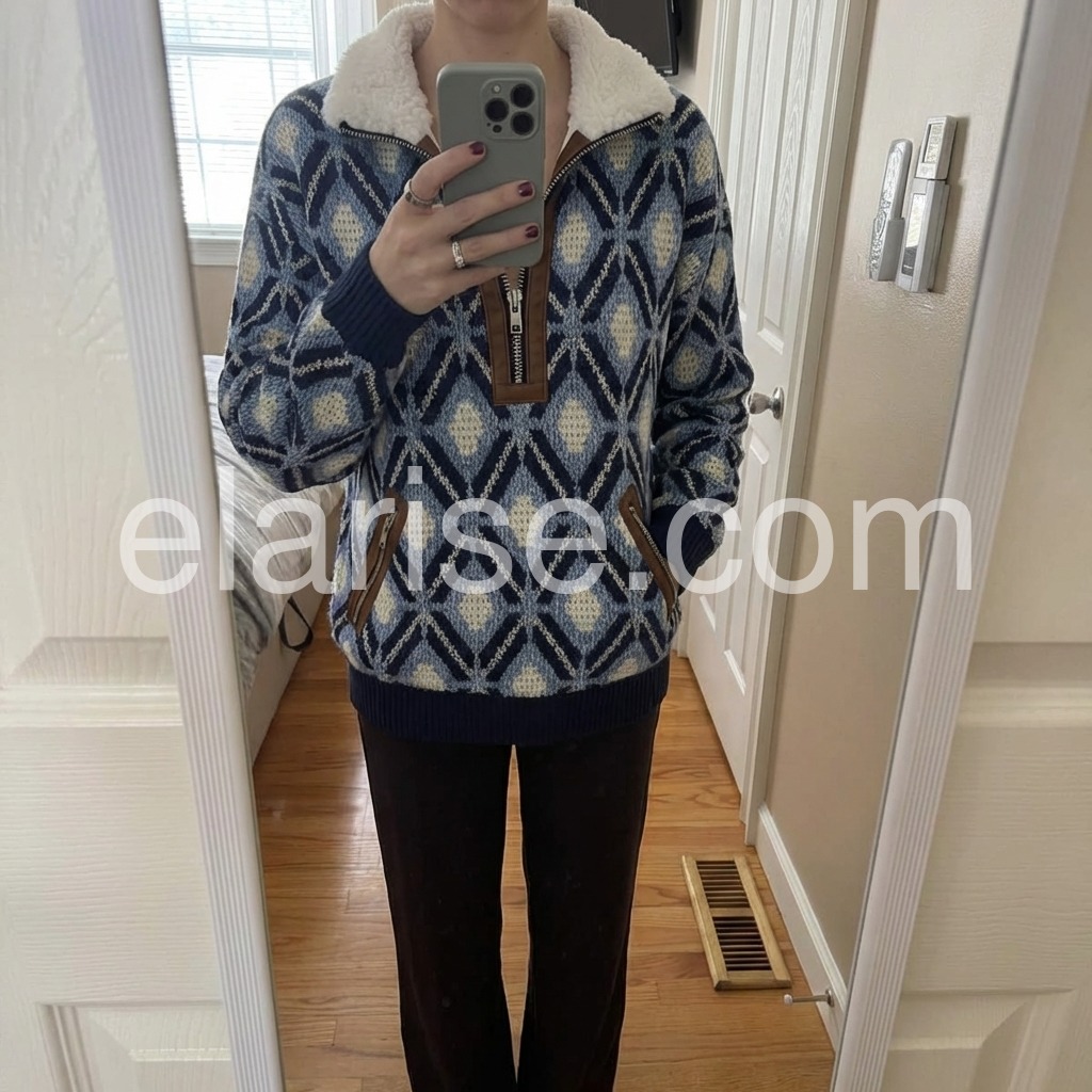 This sweater is the perfect blend of cozy and chic! The geometric pattern in shades of blue and white is so classic and timeless, and the fur collar makes it feel extra special. The leather trim on the zipper and pockets adds a nice detail that elevates the whole look. The fabric is soft and stretchy, so it’s comfortable to wear all day. I love pairing it with jeans and boots for a casual, outdoorsy look. It’s quickly become my go-to for cool weekends!