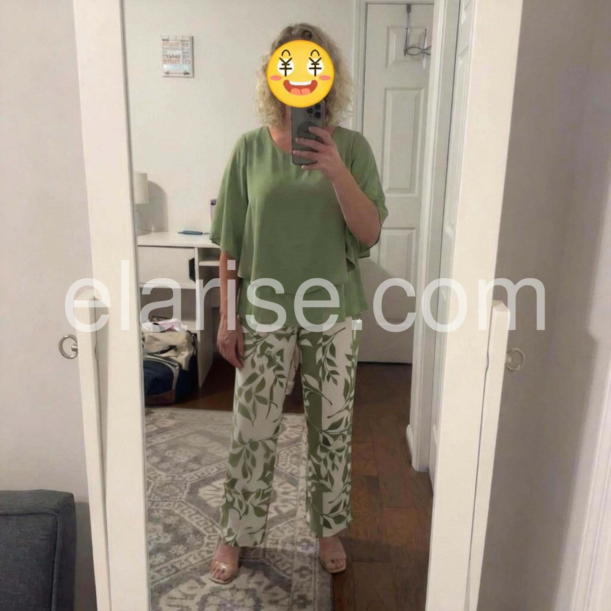 I absolutely love this two-piece set! The flowy green top is so flattering and completely hides my tummy, while the leaf print pants are incredibly comfortable. True to size and perfect for my upcoming cruise.