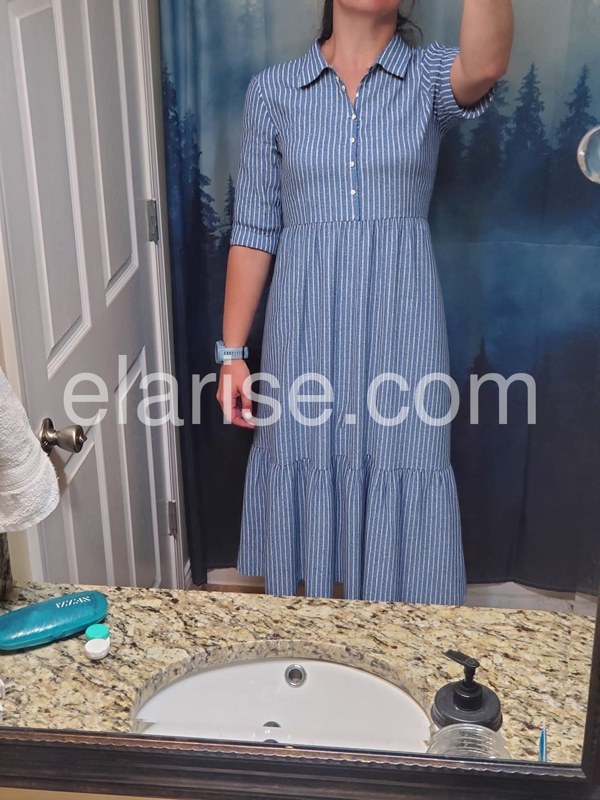 This dress completely exceeded my expectations. It is so hard to find a good maxi dress with sleeves. The tiered layers give it a lovely movement when you walk. Five stars!