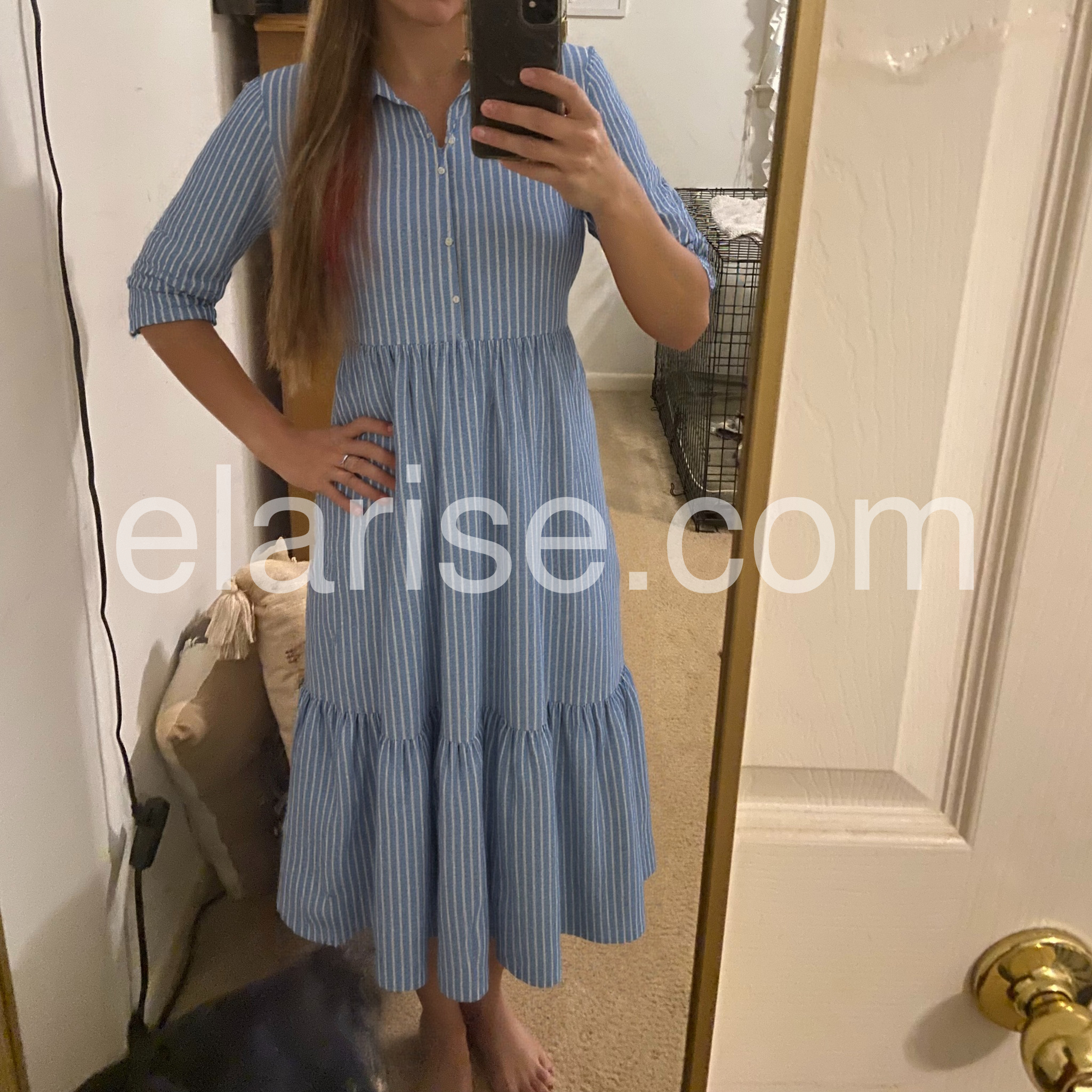 Absolutely love this dress! The light blue and white stripes give it such a classic, beachy vibe. It is incredibly comfortable and flowy, perfect for hot summer days. I paired it with a straw bag just like the picture and got so many compliments.